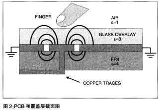 在PCB上通過一個(gè)過孔將感應(yīng)器焊盤連接到電路板底層的一條走線上,如圖2所示。當(dāng)電場嘗試著尋找回地的最短路徑時(shí),介電常數(shù)εr會(huì)影響到材料中電場能量的緊密程度。標(biāo)準(zhǔn)窗口玻璃的介電常數(shù)大約為8,而PCB的FR4材料介電常數(shù)大約為4。通常使用在白色家電商品上的高硬度玻璃的介電常數(shù)則約為5。在這個(gè)設(shè)計(jì)實(shí)例中,使用的是標(biāo)準(zhǔn)窗戶玻璃。要注意的是,玻璃板是用3M公司的不導(dǎo)電黏合膠帶468-MP安裝在電路板上的。