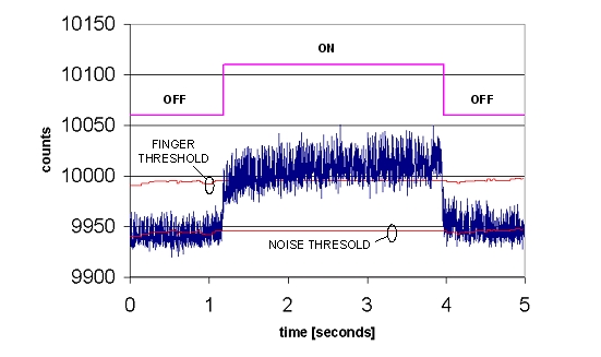 同時(shí)還給出了門限值。噪聲門限被設(shè)定的計(jì)數(shù)值為10,而手指門限設(shè)定的計(jì)數(shù)值則為60。實(shí)際上,在實(shí)際計(jì)數(shù)數(shù)據(jù)中始終存在噪聲分量,圖中并未顯示,以便能清晰地顯示門限水平。