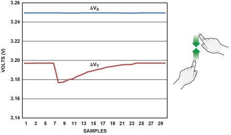 圖 3 顯示了一個(gè)沿著垂直(Y)軸捏合的例子。當(dāng)手勢(shì)開始時(shí),其中一層的兩根電極之間的電壓恒定不變,另一層則表現(xiàn)出階躍性降低,然后隨著手指相互靠近而提高。
