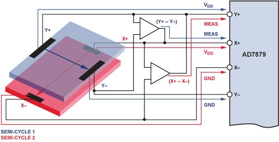 半周期 2:電壓施加于X層,同時(shí)測(cè)量(VX+ – VX–)、VY–和VY+。