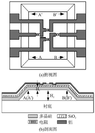 采用MEMS 技術的小量程、高靈敏壓力傳感器通常有平膜、島膜、梁膜等結構,在設計過載保護時,一般采用凸臺等方法實現,形成方法有背部刻蝕技術、硅直接鍵合( SDB) 技術、玻璃刻蝕技術等。然而這些結構的腔體尺寸較大,進一步提高靈敏度受到限制,而且降低了硅片利用率,增加了制造工藝的復雜度,提高了生產成本。目前小量程、高靈敏壓力傳感器的研究熱點集中在犧牲層結構壓力傳感器,這主要是因為犧牲層結構壓力傳感器彈性膜片很薄,厚度可做到2 μm,甚至更薄。在這樣薄的結構上,如果采用擴散硅或多晶硅薄膜作為犧牲層結構壓力傳感器的應變電阻,其厚度相對較大,對彈性膜片應力分布影響很大,不利于犧牲層結構壓力傳感器的性能優(yōu)化,因此采用多晶硅納米薄膜制作應變電阻更能發(fā)揮犧牲層技術的優(yōu)點。