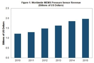到2015年,MEMS壓力傳感器銷售額將達(dá)到19.7億美元,如圖1所示,2010-2015年的復(fù)合年度增長(zhǎng)率為10%。