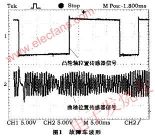 故障分析與測試采用雙蹤示波器同時測量故障車上曲軸位置傳感器與凸輪軸位置傳感器的波形如圖1所示,在同類型的正常車上測得的凸輪軸位置傳感器和曲軸位置傳感器波形如圖2所示?!?br />