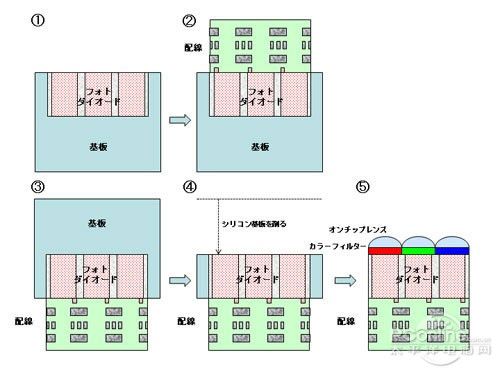 背照式CMOS傳感器的具體結(jié)構(gòu)如上圖所示(源自索尼資料,其他芯片廠家的產(chǎn)品可能在細節(jié)上有不同,但大體意思是相同的),橙色的為光線路,黃色線為受光面。左邊的傳統(tǒng)式,明顯看到光線通過微透鏡后還需要經(jīng)過電路層才能到達受光面,中途光線必然會遭到部分損失(包括被阻擋或被減弱)。背照式CMOS傳感器的元件則不同,在改變了結(jié)構(gòu)后,光線通過微透鏡后就可以直接到達感光層的背面,完成光電反應(yīng),從進光量上改善了感光過程。