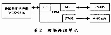 數(shù)據(jù)處理單元由磁敏角度感應(yīng)器、微處理器單元、通信接口以及輸出模塊,具體的功能框如圖2所示。