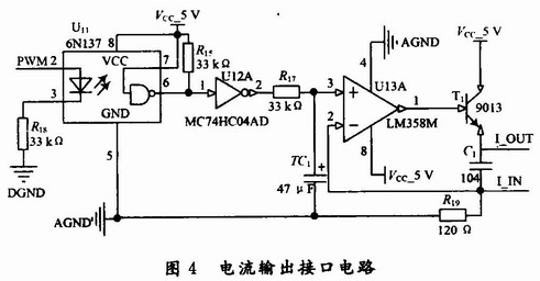 數(shù)據(jù)處理單元具備一路可控4~20 mA的電流輸出,用于現(xiàn)場(chǎng)指示儀表的驅(qū)動(dòng)。具體的連接電路如圖4所示。其中PWM2連接ARM的PWM2引腳,PWM信號(hào)用于控制光耦的導(dǎo)通與截止,反相器主要用于波形的整定,根據(jù)磁敏角度和位移關(guān)系,建立數(shù)學(xué)模型,計(jì)算出PWM的占空比,從而達(dá)到電流大小調(diào)節(jié)的目的。