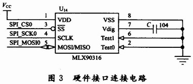 由于串行通信的輸出信號(hào)直接來(lái)自于MLX90316的內(nèi)部DSP輸出,SPI輸出模式更穩(wěn)定,誤差更小,并且具有更高的抗干擾能力。在本設(shè)計(jì)中,選用SPI接口,具體的硬件接口連接電路如圖3所示。在圖3中,MLX90316的SPI三根線與ARM LPC2136的SPl0口連接。SPI(SerialProtocol InterIace)總線接口是一種同步串行外設(shè)接口。這是一個(gè)4根信號(hào)線的串行接口協(xié)議,包括主、從兩種模式。這4根信號(hào)線分別是:時(shí)鐘線(SCK)、數(shù)據(jù)輸入線(MISO)、數(shù)據(jù)輸出線(MOSI)和從設(shè)備使能線(SS)。