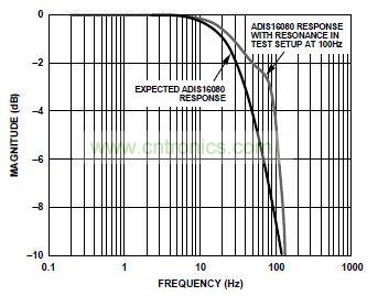 確定傳感器步進(jìn)響應(yīng)對(duì)于隔離在確定帶寬特性時(shí)觀察到的諧振條件很有用。圖1所示為一種采用ADIS16080的系統(tǒng)的頻率響應(yīng)。圖中所示諧振頻率為100 Hz。開始時(shí),該諧振到底是傳感器行為導(dǎo)致,還是系統(tǒng)中的機(jī)械諧振所導(dǎo)致,這并不清楚。幸運(yùn)的是,步進(jìn)響應(yīng)(如自測(cè)功能所確定)可以區(qū)分這兩種效應(yīng)。圖2顯示了兩種條件下的坐標(biāo)曲線圖:測(cè)試設(shè)置導(dǎo)致的諧振和傳感器本身導(dǎo)致的諧振。