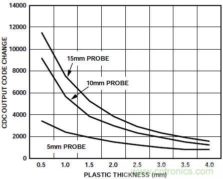 另外值得注意的是探頭尺寸對(duì)傳感器響應(yīng)的影響。較小的探頭只能少量降低接收器上測(cè)得的電容。手指尺寸的影響也是一樣,手指越小,傳感器響應(yīng)也越小。