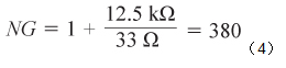 電阻R4使跨導(dǎo)放大器的噪聲增益保持在合理水平。R4的值需權(quán)衡兩個因素:噪聲增益的幅度和暴露于高濃度氣體時傳感器的建立時間誤差。對于本電路,R4 = 33 Ω,由此可計(jì)算噪聲增益等于380,如公式4所示。