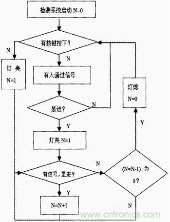 系統(tǒng)流程圖如圖5所示。其中N表示洗手間內(nèi)現(xiàn)有的人數(shù),當檢測系統(tǒng)電源連上后,光電傳感器開始檢測,但系統(tǒng)不知道洗手間內(nèi)此時是否有人,默認是無人,因而燈是不會亮的,這時按鍵可以用來對系統(tǒng)進行調(diào)整。當光強增大到一定值時,檢測系統(tǒng)自動停止工作。