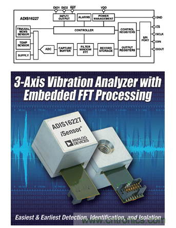 在一些應(yīng)用案例中,相對簡單的傳感器輸出可能就足夠了,但在另一些應(yīng)用中(例如,通過震動分析進(jìn)行狀態(tài)監(jiān)控),則需要增加相當(dāng)多的處理過程才能實(shí)現(xiàn)所需的輸出。圍繞慣性傳感器而構(gòu)建的一個(gè)高集成度器件示例是ADIS16227(見圖2),它是一款完全自治的頻域震動監(jiān)控器。此類器件可能不提供相對簡單的g/mV輸出,而是提供特定應(yīng)用分析。在本例中,其嵌入式頻域處理、512點(diǎn)實(shí)值FFT和片上存儲器能夠識別各震動源并進(jìn)行歸類,監(jiān)控其隨時(shí)間的變化情況,并根據(jù)可編程的閾值做出反應(yīng)。