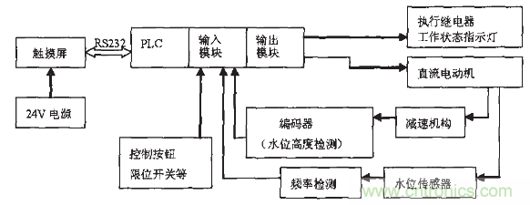 作為主電機(jī)的直流電動(dòng)機(jī)由PLC進(jìn)行控制,電機(jī)實(shí)現(xiàn)PID調(diào)速,電機(jī)的輸出通過(guò)減速機(jī)構(gòu)與執(zhí)行機(jī)構(gòu)相連,最后帶動(dòng)細(xì)鋼管在水箱中上下移動(dòng)來(lái)按檢測(cè)要求控制管內(nèi)水位高度的準(zhǔn)確變化,通過(guò)編碼器實(shí)現(xiàn)水位高度變化的實(shí)時(shí)檢測(cè),頻率的實(shí)時(shí)檢測(cè)由PLC的高速計(jì)數(shù)器來(lái)完成。控制命令的輸入接PLC的輸入端,PLC的輸出端接執(zhí)行繼電器和工作狀態(tài)指示燈等。