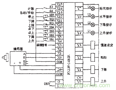 圖2為PLC控制系統(tǒng)硬件接線(xiàn)圖。輸入X0~X1為編碼器的A、B相輸出脈沖信號(hào),X3為振蕩頻率信號(hào),X4~X14為按鈕、選擇開(kāi)關(guān)、限位開(kāi)關(guān)和計(jì)數(shù)開(kāi)始等信號(hào),輸出Y0~Y7分別控制繼電器、信號(hào)指示燈等。