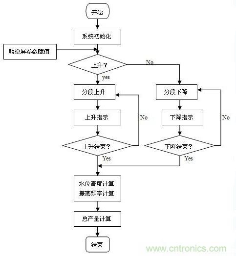 系統(tǒng)中采用觸摸屏作為人機(jī)界面,顯示操作畫(huà)面,進(jìn)行參數(shù)修改和指令輸入。通過(guò)觸摸屏可實(shí)現(xiàn)水位上升、下降高度等參數(shù)的設(shè)定和修改,實(shí)現(xiàn)實(shí)際水位高度變化、輸出振蕩頻率和總產(chǎn)量等的實(shí)時(shí)顯示等,并可對(duì)工作進(jìn)程進(jìn)行實(shí)時(shí)監(jiān)控。