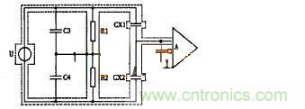 第三個(gè)問(wèn)題是分布電容的影響。由于電容傳感器一個(gè)很關(guān)鍵的問(wèn)題是分布電容電容量與傳感器電容量相比不僅不能忽略,而且影響還極其嚴(yán)重,其后果是造成傳輸效率降低、靈敏度下降、測(cè)量誤差增加及穩(wěn)定性變差。近幾年來(lái),對(duì)此問(wèn)題有了新的解決途徑。其中“整體屏蔽法”就是一例,以差動(dòng)電容傳感器為例,說(shuō)明整體屏蔽法,在下圖中,CX1、CX2為差動(dòng)電容,U為電源,A為放大器,整體屏蔽法是把整個(gè)電橋(包含電源電纜等)一起屏蔽起來(lái),設(shè)計(jì)的關(guān)鍵點(diǎn)在于接地點(diǎn)的合理設(shè)置。采用把接地點(diǎn)放在兩個(gè)平衡電阻R1、R2之間與整體屏蔽共地,這樣,傳感器公用極板與屏蔽之間的分布電容C1與放大器的輸入阻抗并聯(lián),從而可把C1視作放大器的輸入電容。由于放大器的輸入阻抗有極大值,C1的并聯(lián)也不希望存在,但它只影響靈敏度而已,另外兩個(gè)分布電容C3、C4并聯(lián)在橋臂R1、R2上,會(huì)影響電橋的初始平衡和整體靈敏度,并不影響電橋的正常工作。因此,分布參數(shù)對(duì)傳感器電容的影響基本消除,整體屏蔽法是解決電容傳感器分布電容問(wèn)題的很好方法,缺點(diǎn)是使結(jié)構(gòu)復(fù)雜。