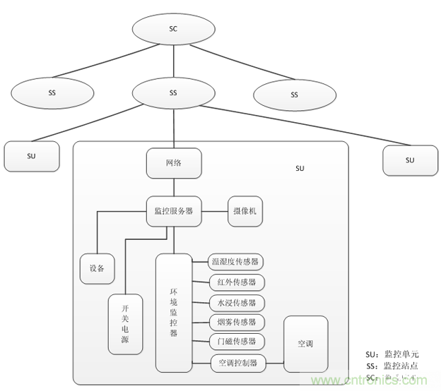 動力環(huán)節(jié)監(jiān)測系統(tǒng)應(yīng)用在機(jī)房、基部站等無人值守的環(huán)境中,對局站內(nèi)的通訊電源、蓄電池組、UPS、發(fā)電機(jī)、空調(diào)等智能、非智能設(shè)備以及溫濕度、煙霧、地水、門禁等環(huán)境量實(shí)現(xiàn)“遙測、遙信、遙控、遙調(diào)”等功能。為了實(shí)現(xiàn)對多個量的監(jiān)測,動環(huán)系統(tǒng)集成了各種類的傳感器,是多傳感器集成系統(tǒng)傳感器“多類型”的一個經(jīng)典案例。同時,此監(jiān)控系統(tǒng)充分利用了通訊傳輸設(shè)備所能提供的各種傳輸信道資源,可以實(shí)現(xiàn)多級網(wǎng)管,能夠?qū)λ芯终镜娜珔?shù)、全方位的監(jiān)控,這又很好體現(xiàn)了多傳感器集成系統(tǒng)傳感器“多數(shù)量”的一面。動環(huán)監(jiān)測系統(tǒng)的組成如下: