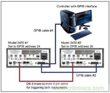 上圖還給出利用GPIB程控通信接口實(shí)現(xiàn)的通信連接。利用GPIB電纜(#1)實(shí)現(xiàn)計(jì)算機(jī)(控制器)GPIB端口與2450型儀器(#1)后面板IEEE-488插孔的連接。利用GPIB電纜(#2)實(shí)現(xiàn)兩部2450型儀器IEEE-488插孔之間的連接。