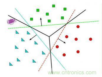 給定隨機數(shù)作為a,c,b的初始值,我們通過訓練數(shù)據(jù)不斷的優(yōu)化參數(shù)a,b,c,把不合適的L1、L3等分類函數(shù)逐漸訓練成L2,這樣的L2去面對泛化的測試數(shù)據(jù)就可能獲得更好的效果。然而如果有多個類別,就需要多條分類直線才能分出,如下圖所示: