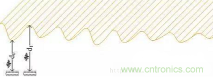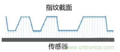 其原理是將電容感整合于一塊芯片中,當(dāng)指紋按壓芯片表面時(shí),內(nèi)部電容感測器會(huì)根據(jù)指紋波峰與波谷而產(chǎn)生的電荷差,從而形成指紋影像。如下簡圖,可以把上面的凹凸認(rèn)為是指紋的谷和脊,那么同傳感器就會(huì)形成不同的電容差,這樣傳感器就可以根據(jù)這些不同的電容差畫出指紋的紋理。