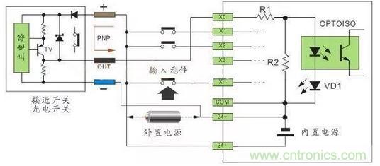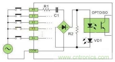 直流電可以由PLC內(nèi)部提供也可以外接直流電源提供給外部輸入信號的元件。R2在電路中的作用是旁路光電耦合器內(nèi)部LED的電流,保證光電耦合器LED不被兩線制接近開關的靜態(tài)泄漏電流導通。