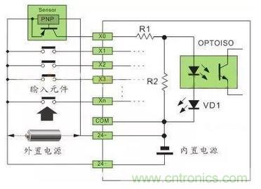 為了節(jié)省輸入端子,單端共點輸入的結構是在 PLC 內(nèi)部將所有輸入電路(光電耦合器)的一端連接在一起接到標示為 COM 的內(nèi)部公共端子,各輸入電路的另一端才接到其對應的輸入端子 X0、X1、X2、....