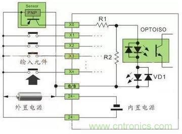 PLC 的數(shù)字量輸入接口并不復雜,PLC 為了提高抗干擾能力,輸入接口都采用光電耦合器來隔離輸入信號與內(nèi)部處理電路的傳輸。因此,輸入端的信號只是驅動光電耦合器的內(nèi)部 LED 導通,被光電耦合器的光電管接收,即可使外部輸入信號可靠傳輸。
