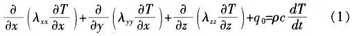 式中:T/x,T/y,T/z為沿x,y,z方向的溫度梯度;λxx,λyy,λzz為熱導(dǎo)率;q0為單位體積的熱生成;ρc是密度與比熱容的乘積:dT/dt為溫度隨時(shí)間的變化率。