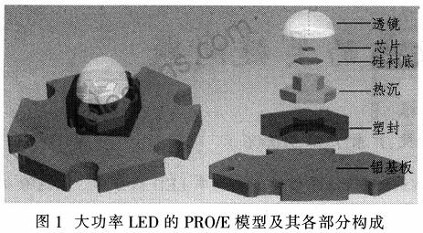 討論在現(xiàn)有結(jié)構(gòu)、LED封裝及熱沉材料熱導(dǎo)率等因素變化對(duì)于其最大功率的影響,尋找影響LED散熱的關(guān)鍵因素。研究方法為有限元熱分析法.該方法已有實(shí)驗(yàn)驗(yàn)證了LED有限元模型與其真實(shí)器件之間的差別,證明其在誤差許可范圍內(nèi)是準(zhǔn)確可行的。