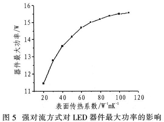 常見對(duì)流散熱方式有兩種:自然對(duì)流和強(qiáng)制對(duì)流。固定結(jié)構(gòu)的散熱與表面?zhèn)鳠嵯禂?shù)有關(guān)??绽浞绞綍r(shí),不同傳熱系數(shù)對(duì)最大功率的影響如圖5所示。強(qiáng)對(duì)流方式在一定速度內(nèi)會(huì)大大提高LED產(chǎn)品的散熱能力,有助于提高散熱效果。