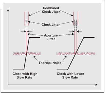 我們在產(chǎn)品說明書中可以找到 ADC 的孔徑口抖動 (aperture jitter)。這一值一般與時鐘振幅或轉(zhuǎn)換速率一起指定,記住這一點很重要。低時鐘振幅帶來低轉(zhuǎn)換速率,從而增加窗口抖動。