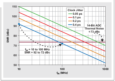 正如我們預計的那樣,利用固定數(shù)量的時鐘抖動,SNR 隨輸入頻率上升而下降。圖 4 描述了這種現(xiàn)象,其顯示了 400 fs 固定時鐘抖動時一個 14 位管線式轉(zhuǎn)換器的 SNR。如果輸入頻率增加十倍,例如:從 10MHz 增加到 100MHz,則時鐘抖動帶來的最大實際 SNR 降低 20dB。